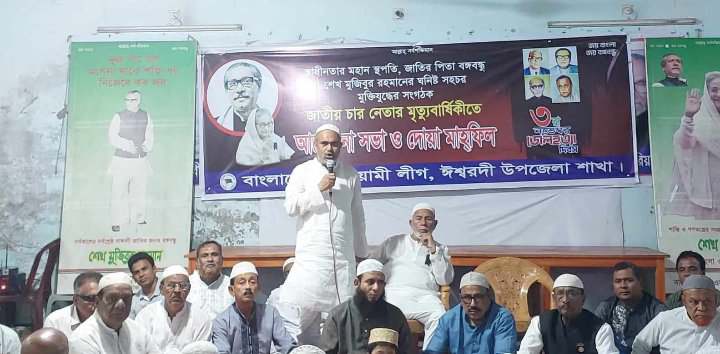 বিকালে দলীয় কার্য়ালয়ে আওয়ামীলীগের সভাপতি ও উপজেলা চেযারম্যান বীরমুক্তিযোদ্ধা আলহাজ্ব নায়েব আলী বিশ্বাসের সভাপতিত্বে এবং সাধারন সম্পাদক আলহাজ্ব আবুল কালাম আজাদ মিন্টুর সঞ্চালিত দোয়া মাহফিলে সমবেত ছিলেন-সহ-সভাপতি গোলাম মোস্তফা চান্না মন্ডল,রশিদুল্লাহ,অধ্যাপক আকরাম আলী খান,শহিদুল আলম পাখি,পৌর আওয়ামীলীগের সভাপতি মোঃ আব্দুল খালেক,পৌর আওয়ামীলীগের সিনিয়র সহ-সভাপতি আফজাল হোসেন খান,পৌরসভার মেয়র ও পৌর আওয়ামীলীগের সাধারন সম্পাদক মোঃ ইছাহক আলী মালিথা, উপজেলা আওয়ামীলীগের যুগ্ন সাধারন সম্পাদক ও উপজেলা পরিষদের ভাইস-চেয়ারম্যান আব্দুস সালাম খান,উপজেলা আওয়ামীলীগের সাংগঠনিক সম্পাদক শফিউল আলম বিশ্বাস,দপ্তর সম্পাদক আজিজুর রহমান চঞ্চল,সহ অগনিত নেতা কর্মী ও সমর্থকবৃন্দ। জাতীয় চার নেতার রুহের মাগফেরাত কামনা করে দোয়া করেন-ঈশ্বরদী কেন্দ্রীয় জামে মসজিদের ঈমাম মুফতি ওয়ালিউল্লাহ ।