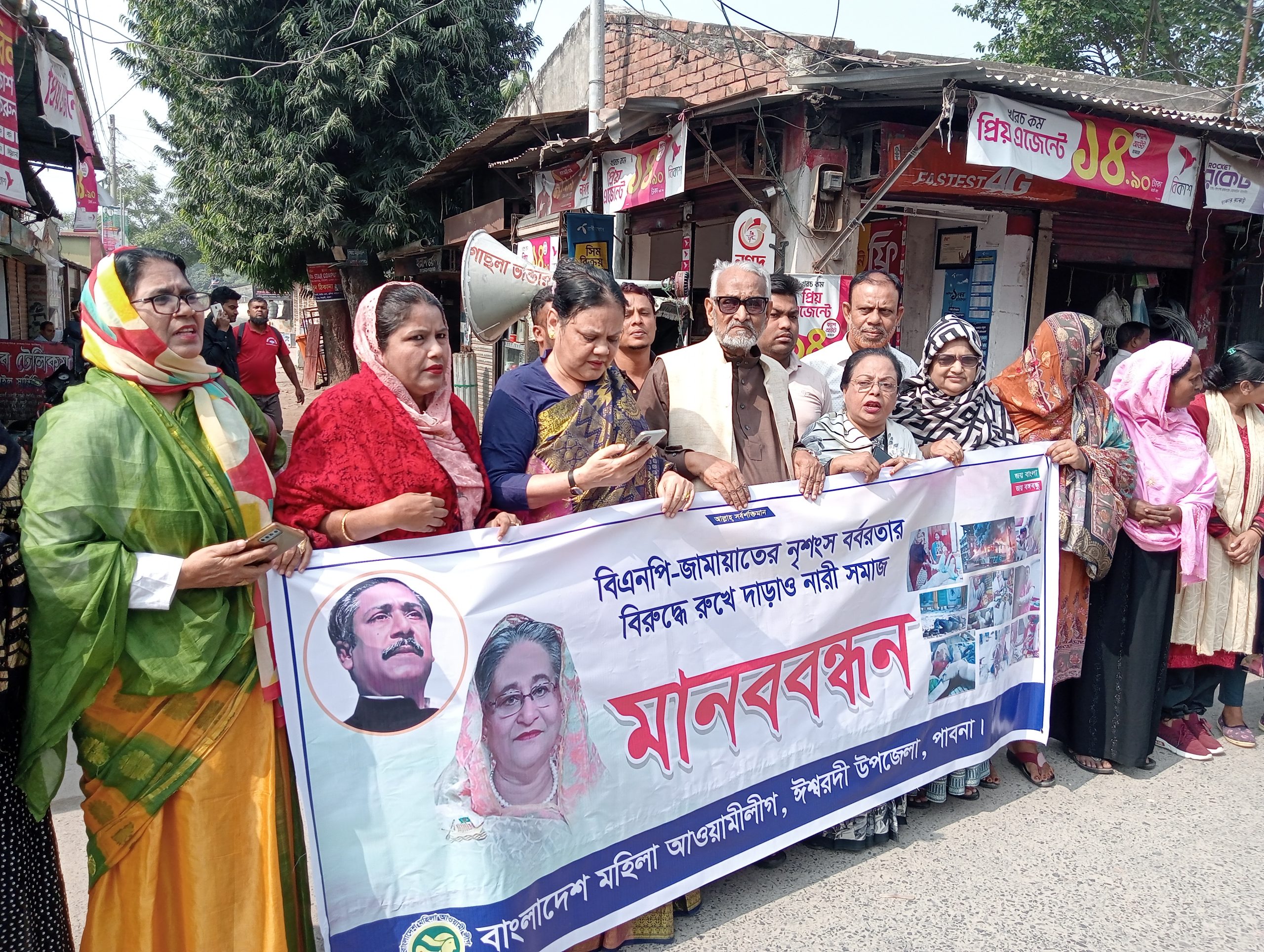‘বিএনপি-জামায়াতের নৃশংস বর্বরতার বিরুদ্ধে রুখে দাড়াও নারী সমাজ’-স্লোগানে ঈশ্বরদীতে অবরোধ-বিরোধী মানববন্ধন ও সমাবেশ অনুষ্ঠিত হয়েছে।