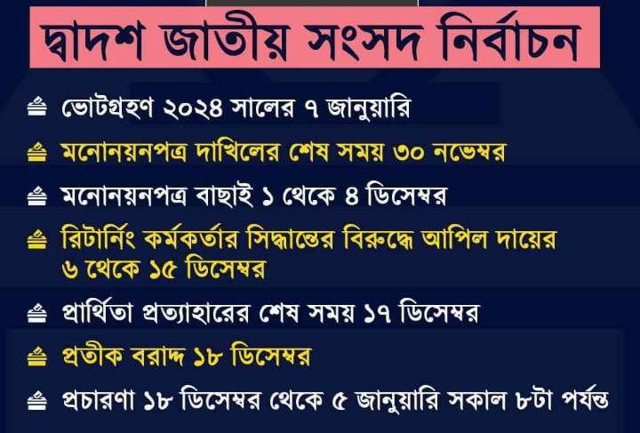 নিজস্ব প্রতিনিধি । হরতাল-অবরোধ,জ্বালাও-পোড়াও,অগ্নিসংযোগ এবং সকল প্রকার জল্পনা-কল্পনার অবসান ঘটিয়ে ১৫ নভেম্বর বুধবার সন্ধ্যা ৭টায় জাতির উদ্দেশে দেওয়া ভাষণে প্রধান নির্বাচন কমিশনার (সিইসি) কাজী হাবিবুল আউয়াল দ্বাদশ জাতীয় সংসদ নির্বাচনের তফসিল ঘোষণা করেন । বাংলাদেশ টেলিভিশন ও বাংলাদেশ বেতার সিইসির ১৫ মিনিটের ভাষণ সম্প্রচার করেন । দ্বাদশ জাতীয় সংসদ নির্বাচনের ভোট গ্রহণ করা হবে আগামী ৭ জানুয়ারি । ঘোষিত তফসিল অনুযায়ী,দ্বাদশ জাতীয় সংসদ নির্বাচনের জন্য মনোনয়নপত্র জমা দেওয়ার শেষ তারিখ ৩০ নভেম্বর । মনোনয়নপত্র বাছাই হবে ১ থেকে ৪ ডিসেম্বর । প্রার্থিতা প্রত্যাহারের শেষ তারিখ ১৭ ডিসেম্বর ডিসেম্বর । রির্টানিং কর্মকর্তার সিদ্ধান্তের বিরুদ্ধে আপিল দায়ের ৬ থেকে ১৫ ডিসেম্বর । প্রতীক বরাদ্দ ১৮ ডিসেম্বর । প্রচার প্রচারনা চলবে ১৮ ডিসেম্বর থেকে ৫ জানুয়ারি সকাল ৮টা পর্য়ন্ত । নির্বাচনকালীন সরকার কী হবে, তা নিয়ে রাজনৈতিক সমঝোতা এখনো হয়নি। বিএনপি-জামায়াত সহ বিরোধীরা বর্তমান সরকারের অধীন নির্বাচনে না যাওয়ার ঘোষণা দিয়ে রেখেছে। বিএনপিসহ সমমনা বিরোধী দলগুলো সরকারের পদত্যাগের দাবিতে হরতাল,অবরোধ কর্মসূচি পালন করছে। সংঘাতময় এ রাজনৈতিক পরিস্থিতির মধ্যেই সংসদ নির্বাচনের তফসিল ঘোষণা করলেন সিইসি।
