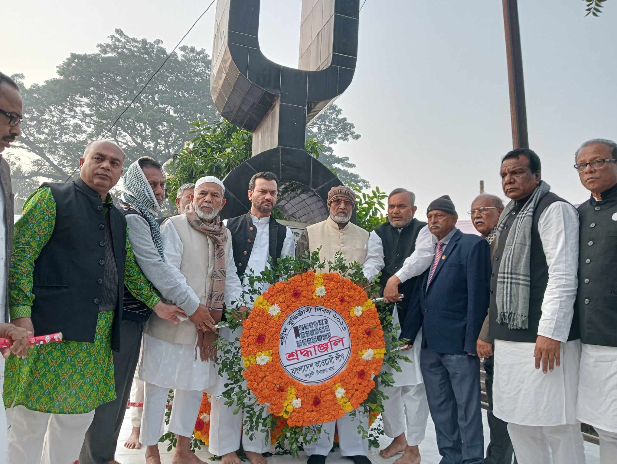 গতকাল ১৪ ডিসেম্বর বৃহস্পতিবার সকাল থেকে রাষ্ট্রীয় কর্মসূচীর সাথে সাথে শহীদ বুদ্ধিজীবীদের প্রতি শ্রদ্ধা জানাতে ঈশ্বরদী প্রেসক্লাব সংলগ্ন বধ্যভূমিতে জড়ো হতে শুরু করেন বিভিন্ন শ্রেণি পেশার মানুষ। তাদের হাতে ফুলের মালা,তোড়া,ডালিসহ ব্যানার,প্লাকার্ড ও ফেস্টুন দেখা যায়। এসময় বধ্যভূমির বেদীতে পূষ্পমাল্য অর্পন করেন মুক্তিযুদ্ধকালীন সময়ে এ অঞ্চলের মুজিব বাহিনীর প্রধান বীরমুক্তিযোদ্ধা আলহাজ্ব নুরুজ্জামান বিশ্বাস এমপি,পাবনা-৪ (ঈশ্বরদী-আটঘরিয়া) আসনে ৭ জানুয়ারির জাতীয় সংসদ নির্বাচনে আওয়ামীলীগ দলীয় নৌকা প্রতিকের প্রার্থী ও পাবনা জেলা আওয়ামীলীগের সাংগঠনিক সম্পাদক এবং প্রধানমন্ত্রী শেখ হাসিনার আস্থাভাজন উদিয়মান তরুন নেতা,সাবেক ভূমিমন্ত্রী শামসুর রহমান শরীফ ডিলুর সুযোগ্য সন্তান গালিবুর রহমান শরীফ,ঈশ্বরদী উপজেলা পরিষদের চেয়ারম্যান ও উপজেলা আওয়ামীলীগের সংগ্রামী সভাপতি বীর মুক্তিযোদ্ধা আলহাজ্ব নায়েব আলী বিশ্বাস,উপজেলা আওয়ামী লীগের বিপ্লবী সাধারণ সম্পাদক ও সাবেক মেয়র আলহাজ্ব আবুল কালাম আজাদ মিন্টু,পৌর মেয়র ও পৌর আওয়ামীলীগের সাধারন সম্পাদক মোঃ ইছাহক আলী মালিথা,উপজেলা নির্বাহী অফিসার সুবীর কুমার দাশ,সহকারী কমিশনার (ভূমি) রাহসীন কবির,নির্বাচন অফিসার আশরাফুল ইসলাম,ঈশ্বরদী মহিলা কলেজের অধ্যক্ষ মোঃ হামিদুর রহমান,সাঁড়া মাড়োয়ারী স্কুল এন্ড কলেজের ভারপ্রাপ্ত অধ্যক্ষ মোঃ শহিদুল হক শাহিন,উপজেলা পরিষদের ভাইস চেয়ারম্যান আব্দুস সালাম খান,মহিলা ভাইস চেয়ারম্যান আতিয়া ফেরদৌস কাকলী,ঈশ্বরদী প্রেসক্লাবের সভাপতি মোস্তাক আহমেদ কিরণ,সাধারন সম্পাদক মোঃ আব্দুল বাতেন । এর পর একে এক বধ্যভূমির বেদীতে পূষ্পার্ঘ অর্পন করেন ঈশ্বরদী মহিলা কলেজের অধ্যক্ষ মোঃ হামিদুর রহমানের নেতৃত্ব সকল শিক্ষ, সাঁড়া মাড়োয়ারী স্কুল এন্ড কলেজের ভারপ্রাপ্ত অধ্যক্ষ মোঃ শহিদুল হক শাহিনসহ সকল শিক্ষকবৃন্দ,বাংলাদেশ শিক্ষক সমিতি ঈশ্বরদী উপজেলা শাখার সভাপতি ফজলুল হক ও সাধারন সম্পাদক মোঃ মোক্তার হোসেন,ঈশ্বরদী সাহিত্য ও সংস্কৃতি পরিষদের সাধারন সম্পাদক বীর মুক্তিযোদ্ধা ই,ম শহিদুল ইসলাম,ঈশ্বরদী সরকারী কলেজের অধ্যাপক (অবঃ) উদয়নাথ লাহেড়ী,উপজেলা আওয়ামী লীগের সহ সভাপতি আ.ত.ম.শহীদুজ্জামান নাসিম,পৌর আওয়ামী লীগের ভারপ্রাপ্ত সভাপতি আব্দুল খালেক,পূর্ব টেংরী বালিকা উচ্চ বিদ্যালয়ের প্রাক্তন প্রধান শিক্ষক বীর মুক্তিযোদ্ধা সিরাজ উদ্দীন বিশ্বাস,মুক্তিযোদ্ধা গোলাম মোস্তফা চান্না মন্ডল,আব্দুল খালেক,নজরুল ইসলাম মিন্টুসহ বিভিন্ন শ্রেনী পেশার মানুষ বধ্যভূমিতে শহীদদের স্মরনে শ্রদ্ধা নিবেদন করেন ।