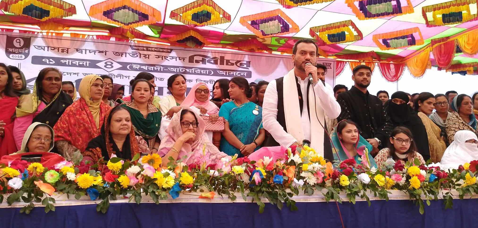 ঈশ্বরদী উপজেলা আওয়ামীলীগের বলিষ্ঠ সভানেত্রী ও গালিব শরীফের গর্ভধারিনী মা মিসেস কামরুনন্নাহার শরীফের সভাপতিত্বে বিশাল নারী মহাসমাবেশে প্রধান অতিথির বক্তব্য প্রদান করেন-ঈশ্বরদী আটঘরিয়া আসনে আওয়ামীলীগ দলীয় নৌকা প্রতিকের মনোনীত প্রার্থী গালিবুর রহমান শরীফ । গালিবুর রহমান শরীফ তার বক্তব্যে বলেন-আমার গর্ভধারিনী মা যিনি দীর্ঘ সময় ধরে অপনাদের পাশে আছেন,আমার বাবার সকল কাজে প্রেরনা যুগিয়েছেন,সেই গর্ভধারিনী মায়ের দোয়া নিয়ে বাবার আদর্শ ও পথ অনুসরন করে আপনাদের সুখে দুঃখে পাশে থাকবার প্রতিশ্রুতিতে বিশ্ব মানবতার মা জননেত্রী শেখ হাসিনা নৌকা প্রতিক দিয়ে আমাকে আপনাদের মাঝে পাঠিয়েছেন । জননেত্রী শেখ হাসিনা আপনাদের প্রতি অত্যন্ত সংবেদনশীল । কাজেই আগামী ৭ জানুয়ারি আপনারা ভোট কেন্দ্রে স্বতঃস্ফুর্তভাবে অংশগ্রহন করে ভোট বিপ্লবের মাধ্যমে আমাকে বিজয়ী করে জননেত্রী শেখ হাসিনার কাছে মাথা উচু করে পাঠাবেন,যেন আমি আপনাদের সকল দাবী দাওয়া উনার কাছ থেকে আদায় করে আনতে পারি । আজকের নারী মহাসমাবেশে উপস্থিত আমার হাজার হাজার মা বোনের সরব উপস্থিতি ও ভালবাসা আমাকে আমার বিজয়ের পথ আরো সুদৃঢ় করেছে বলে আমি বিশ্বাস করি ।