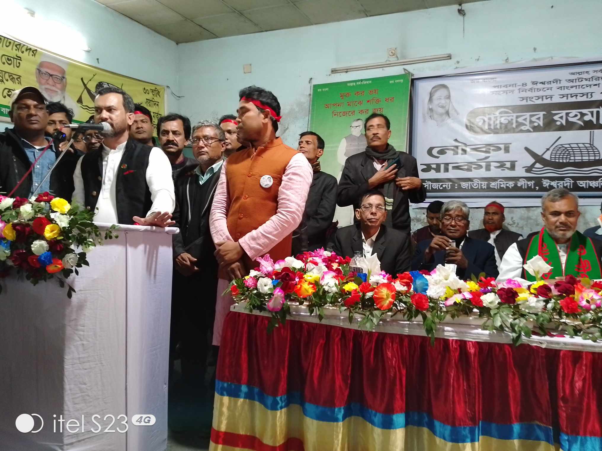 ঈশ্বরদী প্রতিনিধি । জাতয়ি শ্রমিকলীগ ঈশ্বরদী আঞ্চলিক শাখা এবং উপজেলা ও পৌর শ্রমিকলীগের উদ্যোগে পাবনা ৪ আসনে দলীয় প্রধান জননেত্রী শেখ হাসিনার স্নেহধন্য নৌকা প্রতিকের প্রার্থী ও পাবনা জেলা আওয়ামীলীগের আমৃত্যু সভাপতি ও প্রয়াত সাবেক ভূমিমন্ত্রী শামসুর রহমান শরীফ ডিলুর সুযোগ্য পুত্র গালিবুর রহমান শরীফের নৌকা প্রতিককে বিজয়ী করার লক্ষে ১লা জানুয়ারি সোমবার সকালে ঈশ্বরদী উপজেলা আওয়ামীলীগ কার্য়ালয়ে এক সমাবেশ অনুষ্ঠিত হয়। শ্রমিকলীগের সভাপতি মোঃ জাহাঙ্সাগির হোসেনের সভাপতিত্ধাবে ্নএবং সম্পাদক মোঃ ইব্রাহিম হোসেনের সঞাচাললনায় অনুষ্ঠানে প্রধান অতিথির বক্তব্য প্রদান করেন-ঈশ্বরদী আটঘরিয়া আসনে আওয়ামীলীগ দলীয় নৌকা প্রতিকের মনোনীত প্রার্থী গালিবুর রহমান শরীফ । গালিবুর রহমান শরীফ তার বক্তব্যে বলেন-আমার গর্ভধারিনী মা যিনি দীর্ঘ সময় ধরে অপনাদের পাশে আছেন,আমার বাবার সকল কাজে প্রেরনা যুগিয়েছেন,সেই গর্ভধারিনী মায়ের দোয়া নিয়ে বাবার আদর্শ ও পথ অনুসরন করে আপনাদের সুখে দুঃখে পাশে থাকবার প্রতিশ্রুতিতে বিশ্ব মানবতার মা জননেত্রী শেখ হাসিনা নৌকা প্রতিক দিয়ে আমাকে আপনাদের মাঝে পাঠিয়েছেন । আপনাদের ঘামে ঝরানো টাকায় কি কষ্জটে সংসার চলে তা আমি জানি। আমি ফপনাদের পাশে আছি ্নেএবং থাকব। ৭ তারিখের পরে আমি আপনাদের জন্ত্রীয একটা ভাল কিছু করার জন্য চেষ্টা করব ।