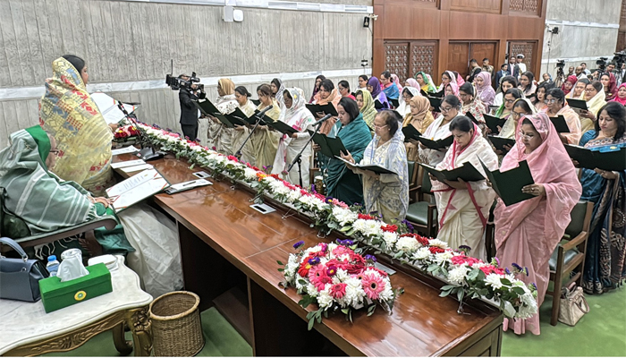 শপথ গ্রহণ করেছেন সংরক্ষিত নারী আসনে নির্বাচিত সংসদ সদস্যরা। বুধবার (২৮ ফেব্রুয়ারি) বিকেল সাড়ে ৩টায় সংসদ ভবনের শপথ কক্ষে প্রথমে আওয়ামী লীগের ৪৮ জন এমপিকে শপথ বাক্য পাঠ করান স্পিকার ড. শিরীন শারমিন চৌধুরী। পরের ধাপে জাতীয় পার্টির দুজন এমপিকে শপথ বাক্য পাঠ করান স্পিকার।