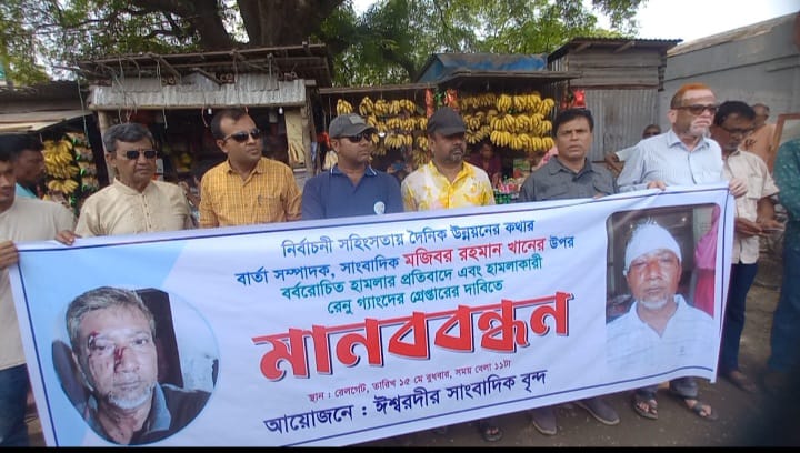 নিজস্ব প্রতিনিধি । দৈনিক উন্নয়নের কথার বার্তা সম্পাদক সাংবাদিক মজিবর রহমান খানের উপর গত ১৪ মে রাতে আলহাজ্ব মোড়স্থ মধ্য অরনকোলা ক্যাম্পে রেনু গং ইট দিয়ে নাকে মুখে ও চোখে আঘাত করে আহত করে । এসময় রেনু গং উপজেলা চেয়ারম্যান প্রার্থী আবুল কালাম আজাদ মিন্টুর মটরসাইকেল প্রতিকের কোন পজেটিভ নিউজ না করার হুমকি প্রদান করে এবং আচমকা পেছন থেকে এলোপাতারী মারপিট শুরু করে মাটিতে ফেলে হত্যার উদ্দেশ্যে নাকে মুখে ও চোখে ইট দিয়ে আঘাত করে । বর্বোরোচিত ও সন্ত্রাসী এ হামলার প্রতিবাদে আজ ১৫ মে বুধবার সকালে ঈশ্বরদী রেলগেটে এক মানব বন্ধন কর্মসূচি অনুষ্ঠিত হয় ।