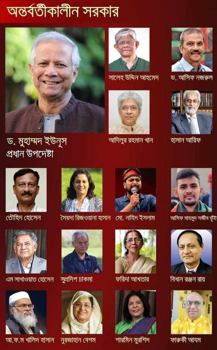 উপদেষ্টা পরিষদে ছাত্র আন্দোলনের দুই সমন্বয়ক : নতুন অন্তর্বর্তী সরকারের উপদেষ্টা হলেন বৈষম্যবিরোধী ছাত্র আন্দোলনের দুই সমন্বয়ক নাহিদ ইসলাম ও আসিফ মাহমুদ সজীব ভূইয়া। এর ফলে বাংলাদেশে নতুন ইসিহাস সৃষ্টি হলো। কারণ এরা দুজনই ঢাকা বিশ্ববিদ্যালয়ের শিক্ষার্থী। ঢাকার বনশ্রীর ছেলে নাহিদ ইসলাম ২০১৬-১৭ শিক্ষাবর্ষে ঢাকা বিশ্ববিদ্যালয়ের সমাজবিজ্ঞান বিভাগে ভর্তি হয়েছিলেন। আর ভাষাবিজ্ঞান বিভাগের ২০১৭-১৮ শিক্ষাবর্ষের ছাত্র আসিফ মাহমুদের বাড়ি কুমিল্লায়। সরকারি চাকরিতে কোটা সংস্কারের দাবিতে তাদের আন্দোলনেই সরকারের পতন হয়। তাদের উপদেষ্টা পরিষদে রাখার ক্ষেত্রে বিভিন্ন পক্ষের বিরোধিতা সত্বেও শেষ পর্যন্ত অনড় ছিলেন ড. ইউনূস।