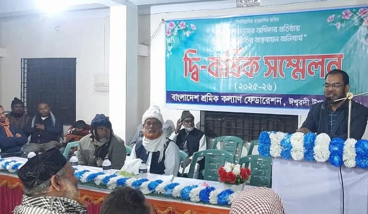 নিজস্ব প্রতিনিধি।। বাংলাদেশ শ্রমিক কল্যাণ ফেডারেশন ঈশ্বরদী উপজেলা শাখার সম্মেলন সম্পন্ন হয়েছে। শনিবার (৭ ডিসেম্বর) সকালে শহরের আলহাজ্ব মোড়স্থ দারুস সালাম ট্রাস্ট মিলনায়তনে এ সম্মেলন শেষে নতুন কমিটির নাম ঘোষণা করা হয়। এতে কন্ঠ ভোটে ২০২৫-২৬ সেশনের জন্য উপজেলা সভাপতি হিসেবে মাহফুজুর রহমান এবং সেক্রেটারি খান আমিনুর রহমান নির্বাচিত হন