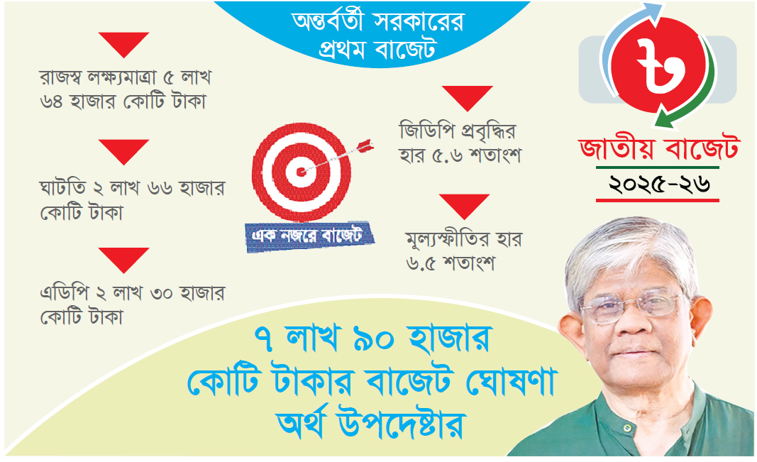 জুলাই গণঅভ্যুত্থানে আওয়ামী লীগ সরকারের পতনের পর দেশের হাল ধরা ড. মুহাম্মদ ইউনূসের নেতৃত্বাধীন অন্তর্বর্তী সরকারের প্রথম বাজেট পেশ হয়েছে গতকাল ০২ জুন সোমবার বিকাল ৩টায় । নতুন ২০২৫-২৬ অর্থবছরের জন্য ৭ লাখ ৯০ হাজার কোটি টাকার বাজেট উপস্থাপন করেছেন অন্তর্বর্তী সরকারের অর্থ উপদেষ্টা সালেহউদ্দিন আহমেদ। সংসদ না থাকায় এদিন বিকেল ৩টায় অর্থ উপদেষ্টার বাজেট বক্তব্য বাংলাদেশ টেলিভিশন ও বাংলাদেশ বেতারে সম্প্রচার করা হয়। অর্থ উপদেষ্টার ভাষ্যে, একটি টেকসই ব্যবস্থা গড়ে তোলার লক্ষ্যে কিছুটা সংস্কারভিত্তিক এ বাজেটে উন্নয়নের সুফল সবার কাছে পৌঁছে দিতে পরিকল্পনা থাকছে। বাজেট বক্তৃতার শুরুতে অর্থ উপদেষ্টা একাত্তরে মহান মুক্তিযুদ্ধে শহীদদের স্মরণ করেন। একইসঙ্গে তিনি স্মরণ করেন জুলাই গণঅভ্যুত্থানের অকুতোভয় শহীদদের। তাদের আত্মার মাগফিরাত কামনা করেন তিনি। অর্থ উপদেষ্টা বলেন, ‘২০২৪ এর গণঅভ্যুত্থানের পর দেশের এক ক্রান্তিলগ্নে অন্তর্বর্তী সরকার দেশ পরিচালনার দায়িত্ব গ্রহণ করে। আমাদের ওপর বর্তায় বিগত সরকারের রেখে যাওয়া প্রায় ধ্বংসপ্রাপ্ত অর্থনীতিকে পুনরুদ্ধার এবং নৈরাজ্য দূর করে জনজীবনে স্বস্তি ফিরিয়ে আনার কঠিন কাজটি। আমি স্বস্তি এবং আনন্দের সাথে জানাতে চাই, মাত্র ১০ মাসেরও কম সময়ে অন্তর্বর্তী সরকার ইতোমধ্যে সে লক্ষ্য পূরণে অনেকদূর এগিয়ে যেতে সক্ষম হয়েছে। জুলাই অভ্যুত্থান এর পর যে আশায় আমরা বুক বেঁধেছিলাম তা খুব শীঘ্রই আমরা পূরণ করতে সক্ষম হবো ইনশাল্লাহ।’অন্তর্বর্তী সরকার দায়িত্ব নেওয়ার প্রায় ১১ মাসের মাথায় অর্থ উপদেষ্টা হিসেবে প্রথমবার বাজেট দিতে গিয়ে সালেহউদ্দিন আহমেদ বিদায়ি অর্থবছরের মূল বাজেটের চেয়ে ব্যয় কমিয়েছেন ৭ হাজার কোটি টাকার। স্বাধীনতার পর এই প্রথম বাজেটের আকার আগের অর্থবছরের চেয়ে কমেছে। দেড় যুগ আগে গভর্নর থাকা সালেহউদ্দিন আহমেদের এটি প্রথম বাজেট। বাস্তবতার সঙ্গে মিল রাখতেই ঘাটতি কমিয়ে বাজেটের আকার ছোট রাখার কথা বলেছেন তিনি। অর্থ উপদেষ্টা বলেন, আন্দোলনের ডামাডোলের মধ্যে নতুন বাজেটে স্বল্প আয়ের মানুষকে ‘স্বস্তি’ দেওয়ার চেষ্টার পরিকল্পনা থাকছে। বয়স্ক ভাতা, বিধবা ভাতা, দুস্থ ভাতা, প্রতিবন্ধীদের ভাতার মতো অনেক সামাজিক নিরাপত্তা কর্মসূচি চালু থাকছে; অল্প হলেও ‘বাড়বে’ ভাতার পরিমাণ ও সুবিধাভোগীর সংখ্যা। ‘জুলাই আন্দোলনে’ সম্পৃক্ত ও ক্ষতিগ্রস্তদের পুনর্বাসনের জন্য বড় আকারে ব্যবস্থা থাকা ‘দরকার’ মনে করছে সরকার।