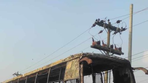 মোটরসাইকেল নিয়ন্ত্রণ হারিয়ে বাসের নিচে, পুড়ল বাস